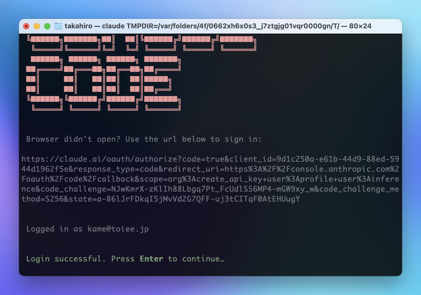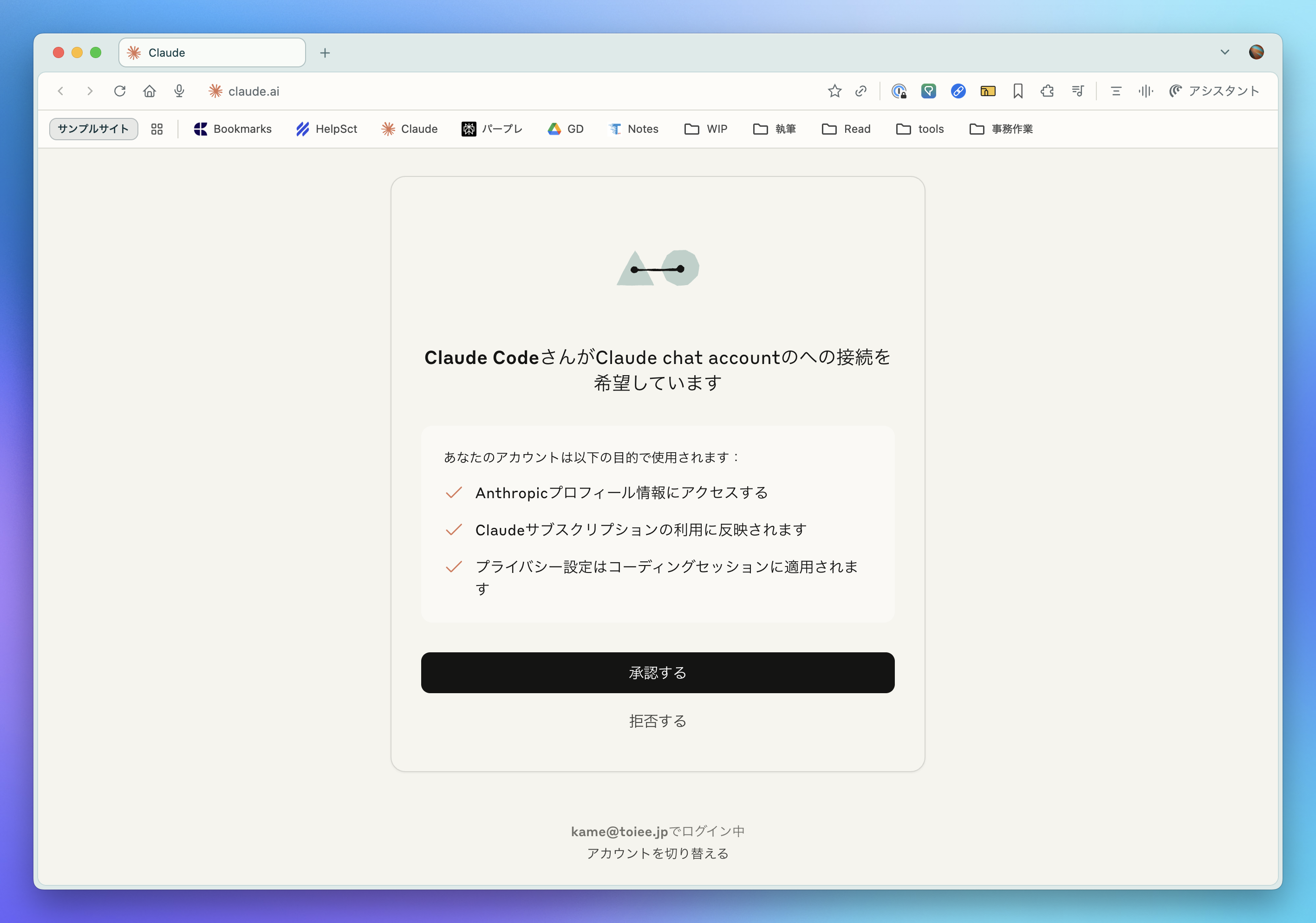 - ブラウザが開くので、Claude.ai の契約でログイン